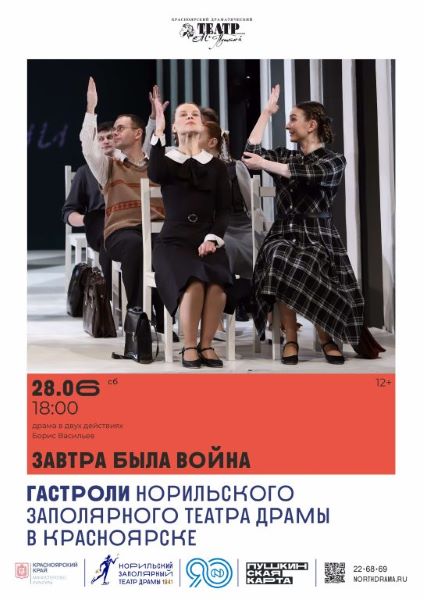 27-29 июня Заполярный театр представит свое творчество на площадках Красноярского драматического театра им. А.С. Пушкина. На большой сцене артисты сыграют спектакли «Та сторона, где ветер», «Волки и овцы», а также спектакль по мотивам знаменитой повести «Завтра была война» режиссера Тимура Файрузова.